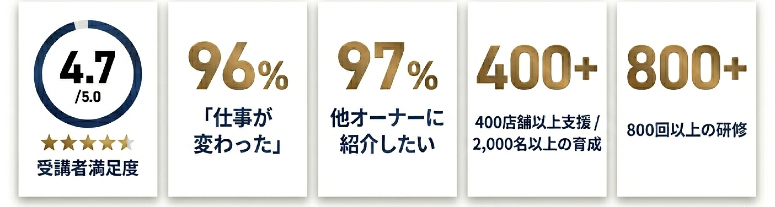 これまでのアンケート569件を集計した結果を更新いたしました。多くの受講生が売上・利益への意識向上を実感し、仕事の仕方に変化を感じていただきました。従業員との関わりが増加したという声も多く、実際の売上向上を報告する店舗も少なくありません。「知った」「数字が楽しくなった」など、受講生からの好評価が多数。上級レベルの受講を希望する声も多く、充実した内容となっております。